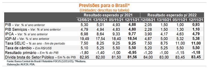 Inflação e Taxa SELIC: o IPCA aguardado tanto para 2021 (de 9,33% para 9,77%) quanto 2022 (4,63% para 4,79%) subiu. Ambas as revisões ocorreram na esteira da leitura oficial de outubro (+1,25%), que excedeu a mediana das projeções dos analistas entrevistados pela Reuters (+1,05%).