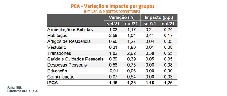 O IPCA cresceu +1,25% em outubro, mostrando aceleração inédita para o período desde 2002. Cabe lembrar que o resultado superou consideravelmente o consenso das instituições sondadas pela Refinitiv (+1,05%). Conforme o IBGE, os nove grandes grupos investigados registraram acréscimo, de modo que três deles responderam por 76,8% da majoração no agregado: “transportes” (+2,62%), “alimentação e bebidas” (+1,17%) e habitação (+1,04%).