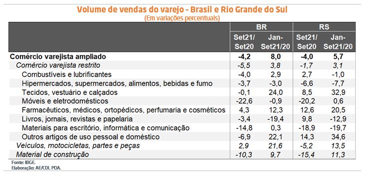 O faturamento deflacionado dos lojistas brasileiros na definição restrita teve queda de 1,3% em setembro em comparação com agosto, nas estatísticas livres de influências sazonais. De acordo com o consenso dos especialistas sondados pela Reuters, a projeção era de recuo de 0,6%. No tocante ao conceito ampliado, que inclui materiais de construção e veículos / motos, a redução foi de 1,1%. Por sua vez, o volume de vendas no Rio Grande do Sul encolheu 1,9% e 0,7%, respectivamente. Nesse último caso, a receita encontra correspondência em julho de 2012.