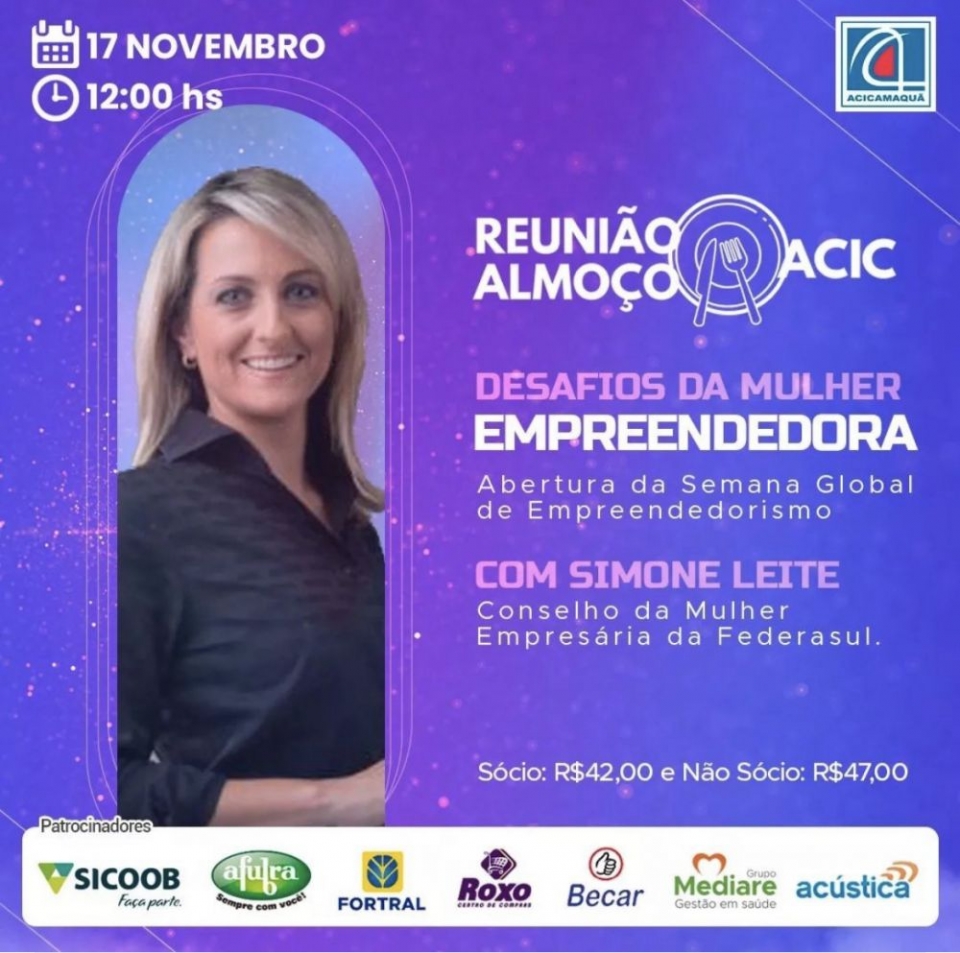 Nesta quinta-feira (17), teremos palestrando em nossa Reunião Almoço, Simone Leite, presidente do Conselho da Mulher Empresária da FEDERASUL.