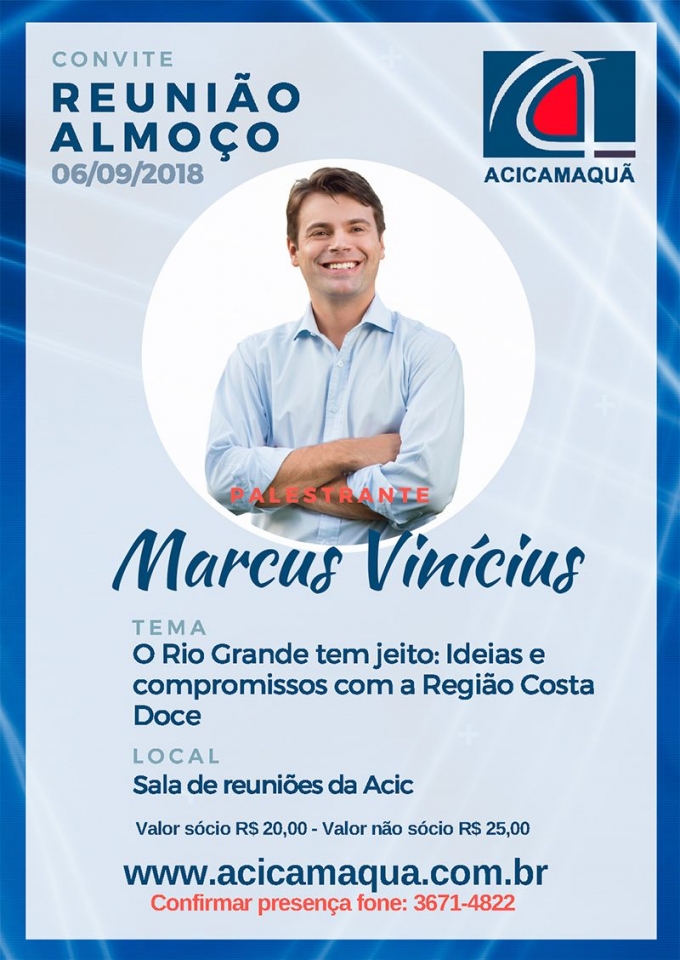 Marcus Vinícius Vieira de Almeida, nascido no município de Tapes, tem 35 anos. Formado em Direito, frequenta o MBA em Gestão e Business Law pela FGV, em parceria com a Forandh University de New York.