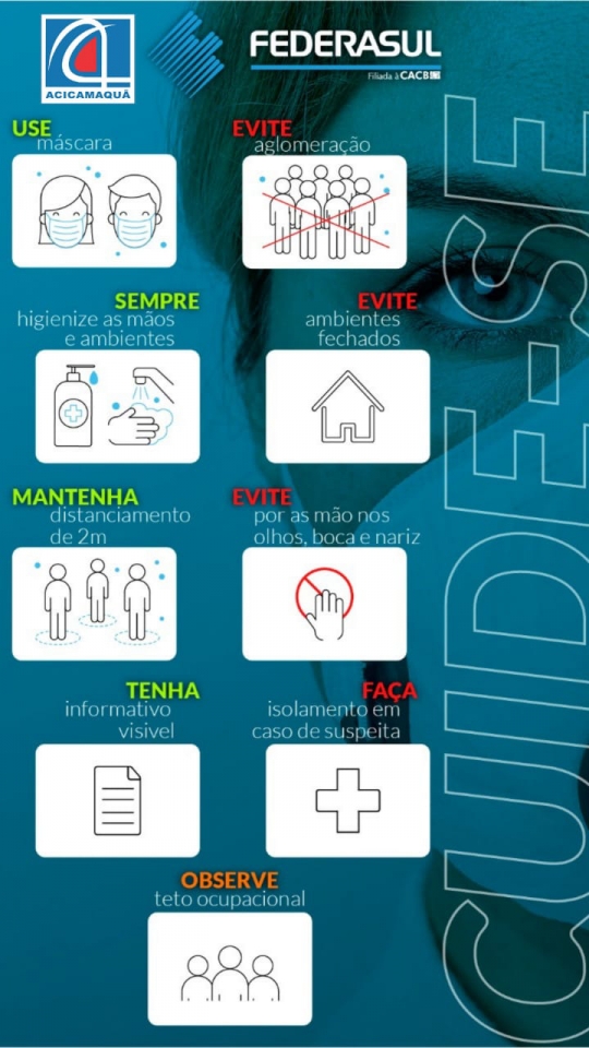 No sentido de contribuir no combate ao Covid-19, a Associação Comercial e Industrial de Camaquã - ACICAMAQUA e a FEDERASUL, divulgam os principais cuidados a serem observados por todos nós, gaúchos.
