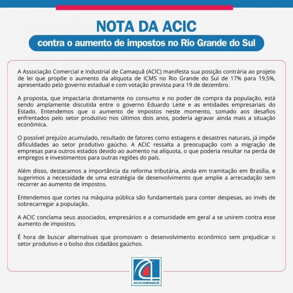 A Associação Comercial e Industrial de Camaquã (ACIC) manifesta sua posição contrária ao projeto de lei que propõe o aumento da alíquota de ICMS no Rio Grande do Sul de 17% para 19,5%, apresentado pelo governo estadual e com votação prevista para 19 de dezembro.