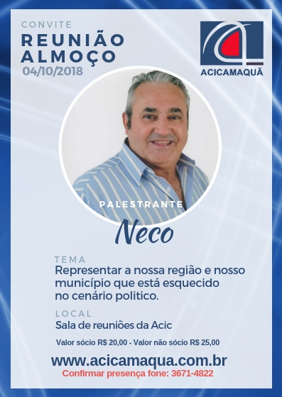Convite Reunião Almoço! 28/09/2018 Aguardamos a sua confirmação! Anterior Próximo ATENÇÃO:Próxima Reunião Almoço, será dia 04/10/2018.Pedimos a gentileza de sua confirmação. Categorias DicasEconomia Galeria de FotosGaleria de VídeosNotícias NovidadesTodas Últimas Notícias NOTA OFICIAL – ACIC CAMAQUÃ 10 de Dezembro de 2025 Conheça as Empresas agraciadas com o Prêmio Destaque Empresarial ACIC 2025 08 de Dezembro de 2025 ACIC divulga as 33 empresas vencedoras do Prêmio Destaque Empresarial 2025 e celebra 90 anos de atuação 02 de Dezembro de 2025 Ênio Waskow Nunes é eleito presidente da ACIC para o biênio 2026–2027 26 de Novembro de 2025 Camaquã Summit 2025 movimenta a região com dois dias de inovação, negócios e saúde 07 de Outubro de 2025 Faltam 30 dias para o Camaquã Summit 2025 24 de Setembro de 2025 ACIC promove mais uma edição da Reunião Almoço com foco em inteligência empresarial e fortalecimento do associativismo 30 de Agosto de 2025 Alunos do Colégio Contemporâneo são premiados como Melhor Miniempresa 2025 e avançam para fase nacional 15 de Agosto de 2025 Reunião-Almoço da ACIC reúne empresários para palestra com Wilson Victorio 15 de Agosto de 2025 ACIC e Junior Achievement celebram formatura da primeira turma do Programa Miniempresa em Camaquã 08 de Agosto de 2025
