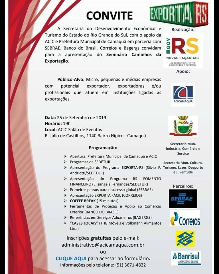Atenção para as inscrições! 25/09/2019 Seminário Caminhos da Exportação Anterior Próximo Data: 25 de Setembro de 2019Horário: 19hLocal: ACIC Salão de Eventos R. Júlio de Castilhos, 1140 Bairro Hípico- Camaquã Categorias DicasEconomia Galeria de FotosGaleria de VídeosNotícias NovidadesTodas Últimas Notícias NOTA OFICIAL – ACIC CAMAQUÃ 10 de Dezembro de 2025 Conheça as Empresas agraciadas com o Prêmio Destaque Empresarial ACIC 2025 08 de Dezembro de 2025 ACIC divulga as 33 empresas vencedoras do Prêmio Destaque Empresarial 2025 e celebra 90 anos de atuação 02 de Dezembro de 2025 Ênio Waskow Nunes é eleito presidente da ACIC para o biênio 2026–2027 26 de Novembro de 2025 Camaquã Summit 2025 movimenta a região com dois dias de inovação, negócios e saúde 07 de Outubro de 2025 Faltam 30 dias para o Camaquã Summit 2025 24 de Setembro de 2025 ACIC promove mais uma edição da Reunião Almoço com foco em inteligência empresarial e fortalecimento do associativismo 30 de Agosto de 2025 Alunos do Colégio Contemporâneo são premiados como Melhor Miniempresa 2025 e avançam para fase nacional 15 de Agosto de 2025 Reunião-Almoço da ACIC reúne empresários para palestra com Wilson Victorio 15 de Agosto de 2025 ACIC e Junior Achievement celebram formatura da primeira turma do Programa Miniempresa em Camaquã 08 de Agosto de 2025